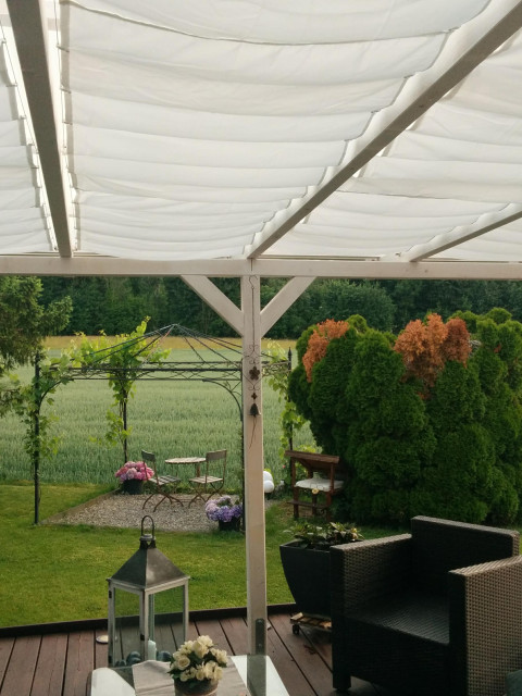 Nachtrag 28.05.2018: Die ersten warmen Tage mit viel Sonne und Gewitter sind bereits vorüber und wir haben festgestellt dass das Dach uns zwar perfekt vom Regen schürtzt, aber die Wärmeentwicklung darunter auch massiv ansteigt. Die vorhandene Markise ist leider viel zu kurz, also muss etwas Neues her. Wir haben uns für eine Innenbeschattung mit Segelstoff und Seilspannvorrichtung entschieden. Keine gute Idee :-) Sieht zwar schön aus, aber die Kosten sind auch relativ hoch wenn man alles fertig kaufen will. Also machen wir wie immer alles (fast alles) selber. Da es den Segelstoff in der benötigten Länge nicht gibt müssen wir uns unsere Bahnen, aus einem günstig gekauften Teil (3 x 2 m) von IKEA, zusammennähen. Ist mehr Aufwand wie gedacht. Wir sind fast 8 Stunden am messen, schneiden, und nähen. Aber auch das wird mal fertig. Und nachdem die Seile gespannt sind können die Bahnen montiert werden. Nun warten wir auf den nächsten heissen Tag mit viel Sonne um zu sehen ob es auch etwas gegen die Wärmeentwicklung hilft.