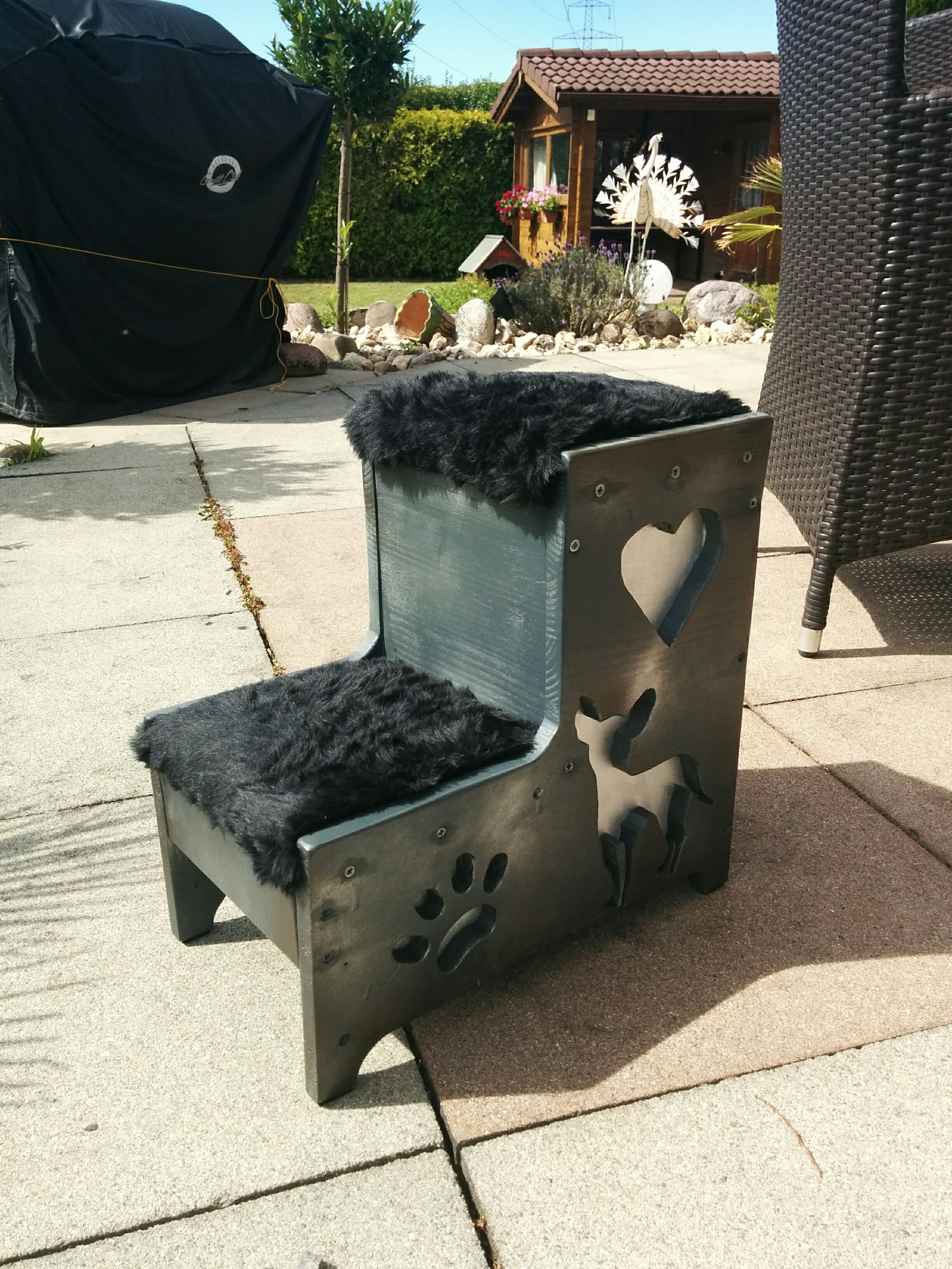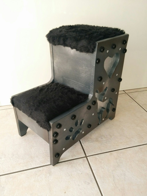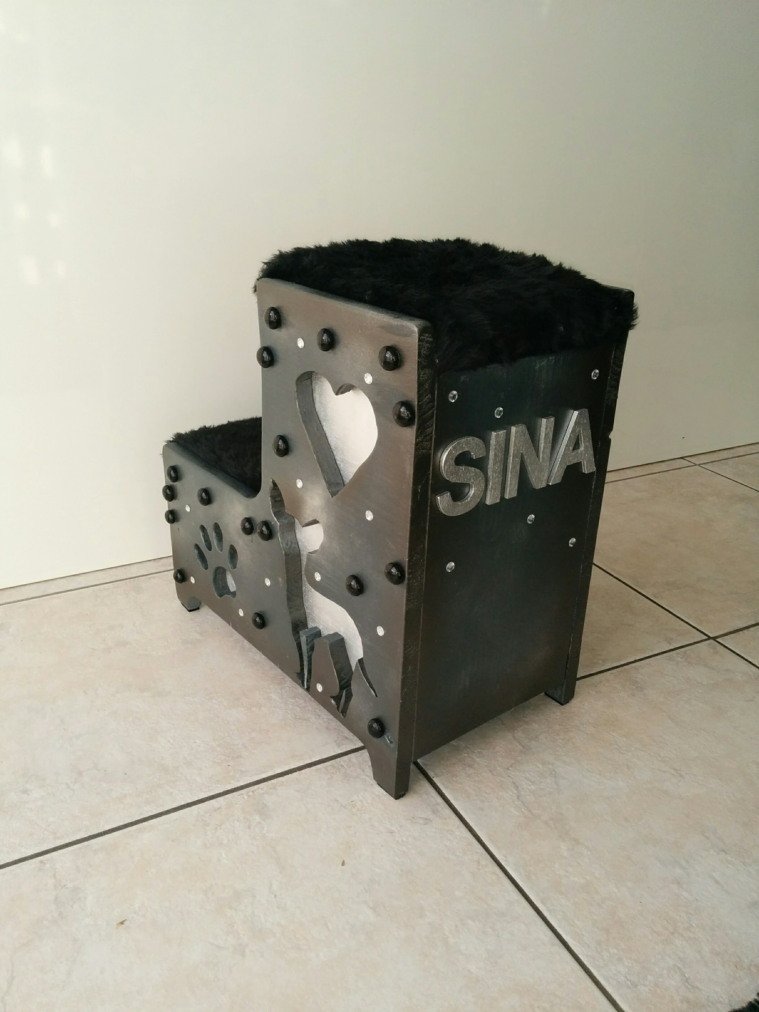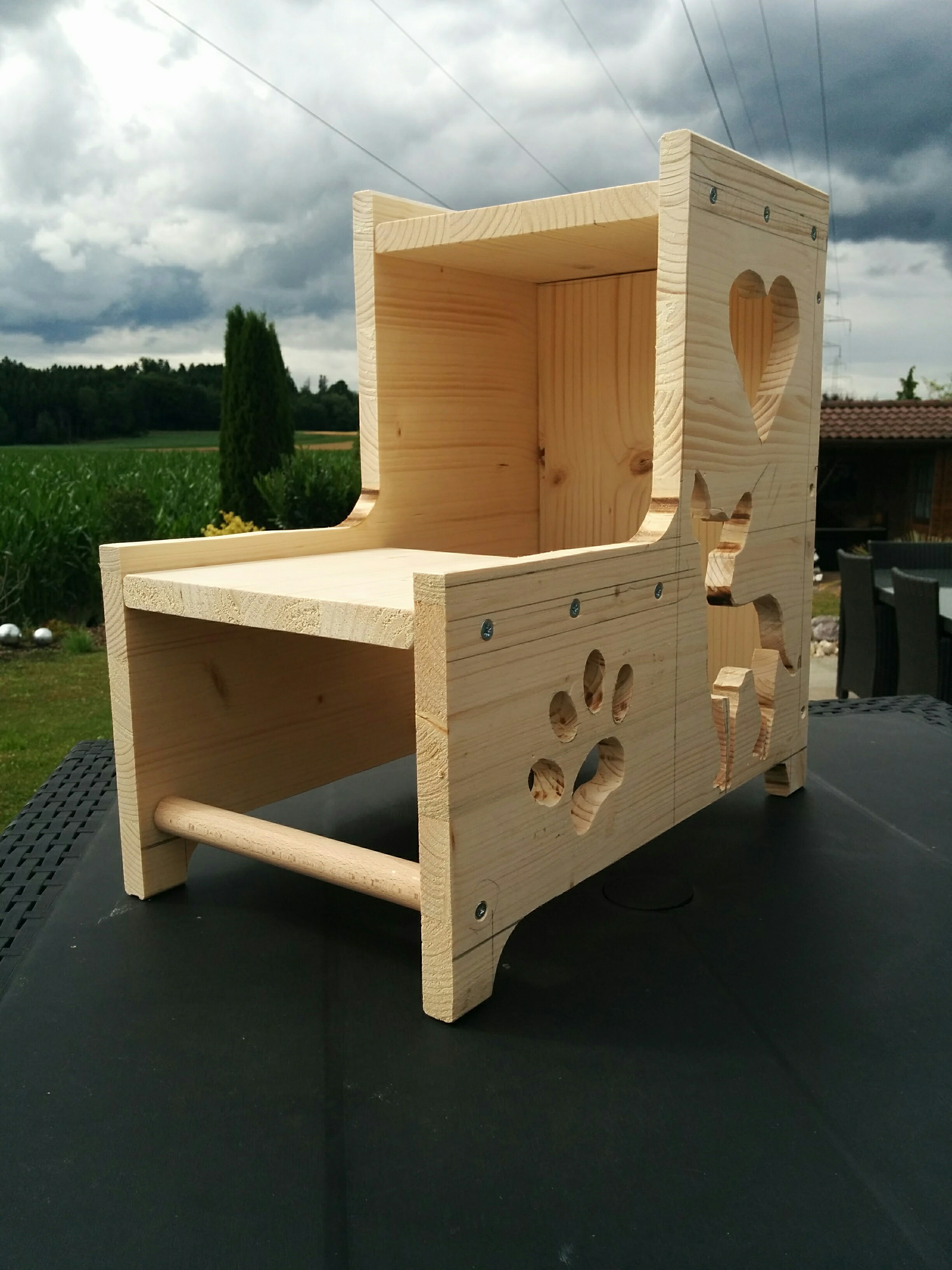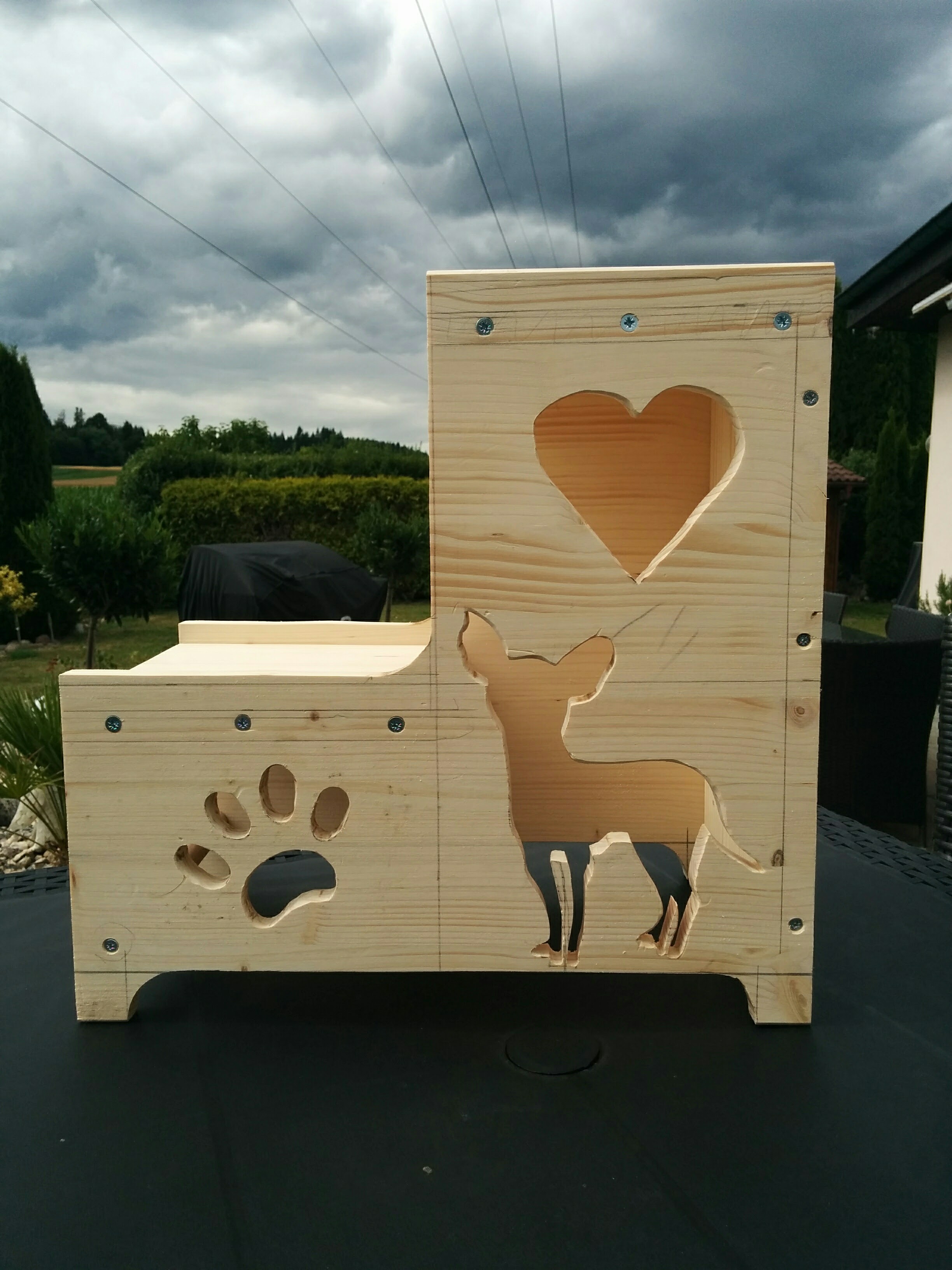 Beschreibung: Da sich die Boxspring Betten immer mehr durchsetzen musste ich mich nach einer Lösung umschauen, und natürlich gleich bauen. Die kleine Sina (gleiche Grösse wie eine Katze) konnte nicht mehr ohne Hilfe auf das Bett ihrer Besitzerin kommen, Das ging gar nicht. Weder für Sina noch die Besitzerin. Also, kurz Mass genommen, Vorrat an Brettern gecheckt und los gings mit dem Bau. Natürlich musste es zu Einrichtugn des Schlafzimmers passen. Also wurde mit viel Schnick-schnack und Bling-bling gearbeitet.