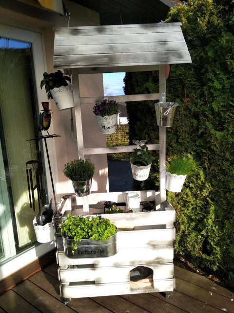 Nachdem die Geburtstafel von Noemi seine Dienst erfüllt hatte und abgebaut wurde, kam die Frage: was machen wir mit dem Ständer? Schade ihn einfach im Cheminee zu verbrennen! Wie immer dauerte es nicht lange bis Yvonne eine gute Idee für das ausgemusterte Teil hatte. Wir machen einen Kräuterwagen für unsere Terrasse. Natürlich nicht so einen "stinknormalen". Wenn dann muss es etwas Speizielles sein. Das Ergebniss seht ihr auf den Bildern. Das Teil passt perfekt auf unsere Terrasse. Und im Winter wird das Katzenhaus natürlich beheizt. Damit kann Mimi auch mal, von Regen und Schnee geschützt, im warmen draussen schlafen.